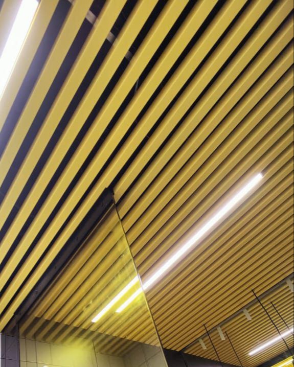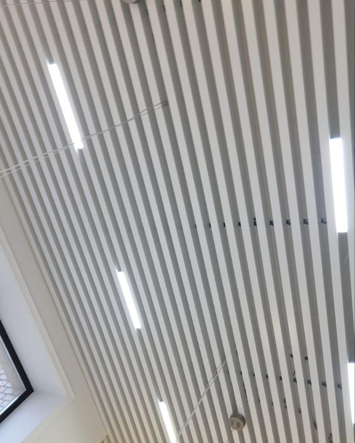 Кубообразный реечный потолок - представляет собой п- образные или v-образные рейки изготовленные из алюминия или оцинкованной стали, которые монтируются по направляющим с зазором (шагом) между друг другом, что позволяет создать объем. У этого вида потолка широкий выбор типоразмеров реек (ширина/высота - от 30мм до 200мм).