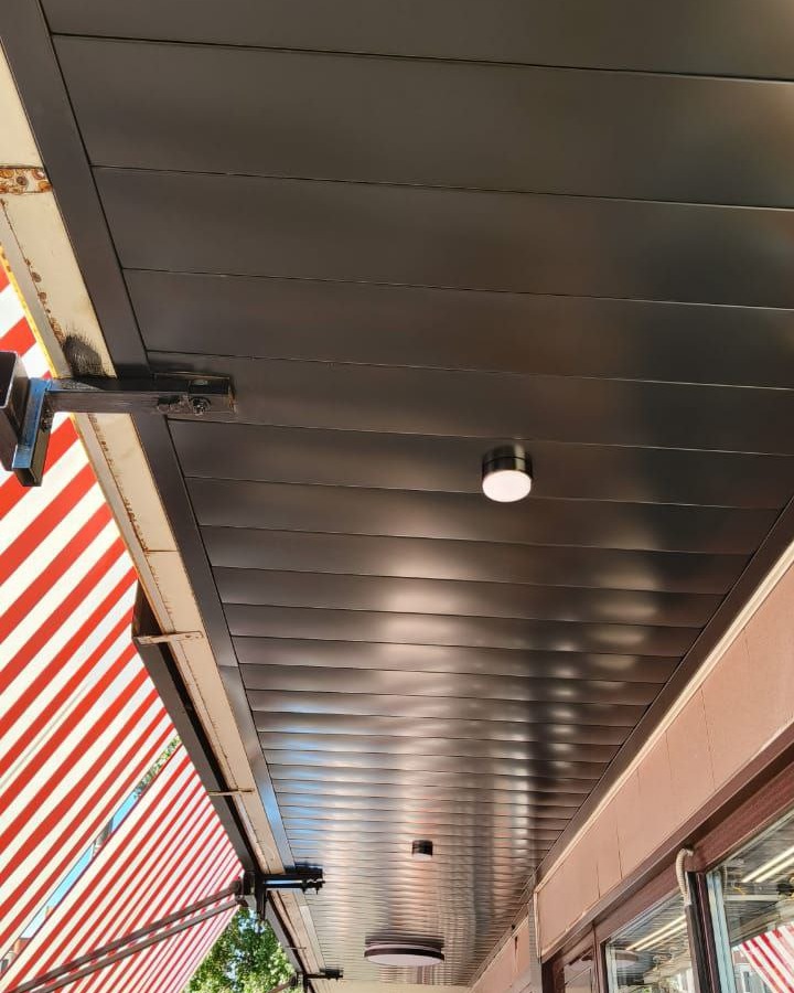 Реечный уличный потолок — это прочная, погодоустойчивая система из оцинкованных реек, созданная для открытых пространств: террас, крытых бассейнов, кафе на свежем воздухе, входных групп.