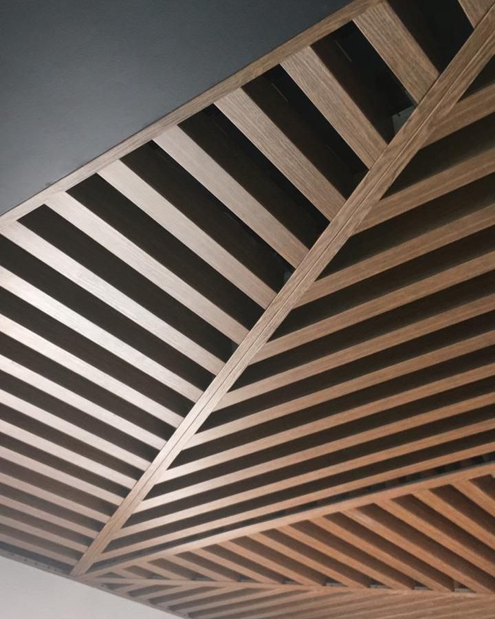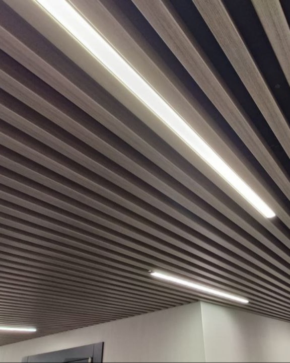 Кубообразный реечный потолок - представляет собой п- образные или v-образные рейки изготовленные из алюминия или оцинкованной стали, которые монтируются по направляющим с зазором (шагом) между друг другом, что позволяет создать объем. У этого вида потолка широкий выбор типоразмеров реек (ширина/высота - от 30мм до 200мм).